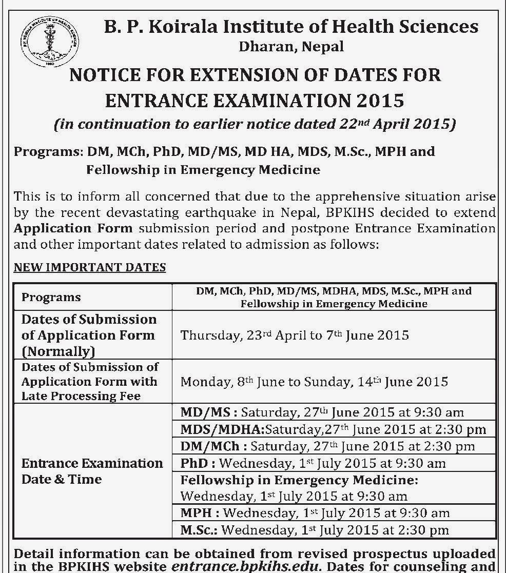 HomeNotice Notice for Extension of Dates for Entrance Examination-BPKIHS May 23, 2015 https://entrance.bpkihs.edu/
